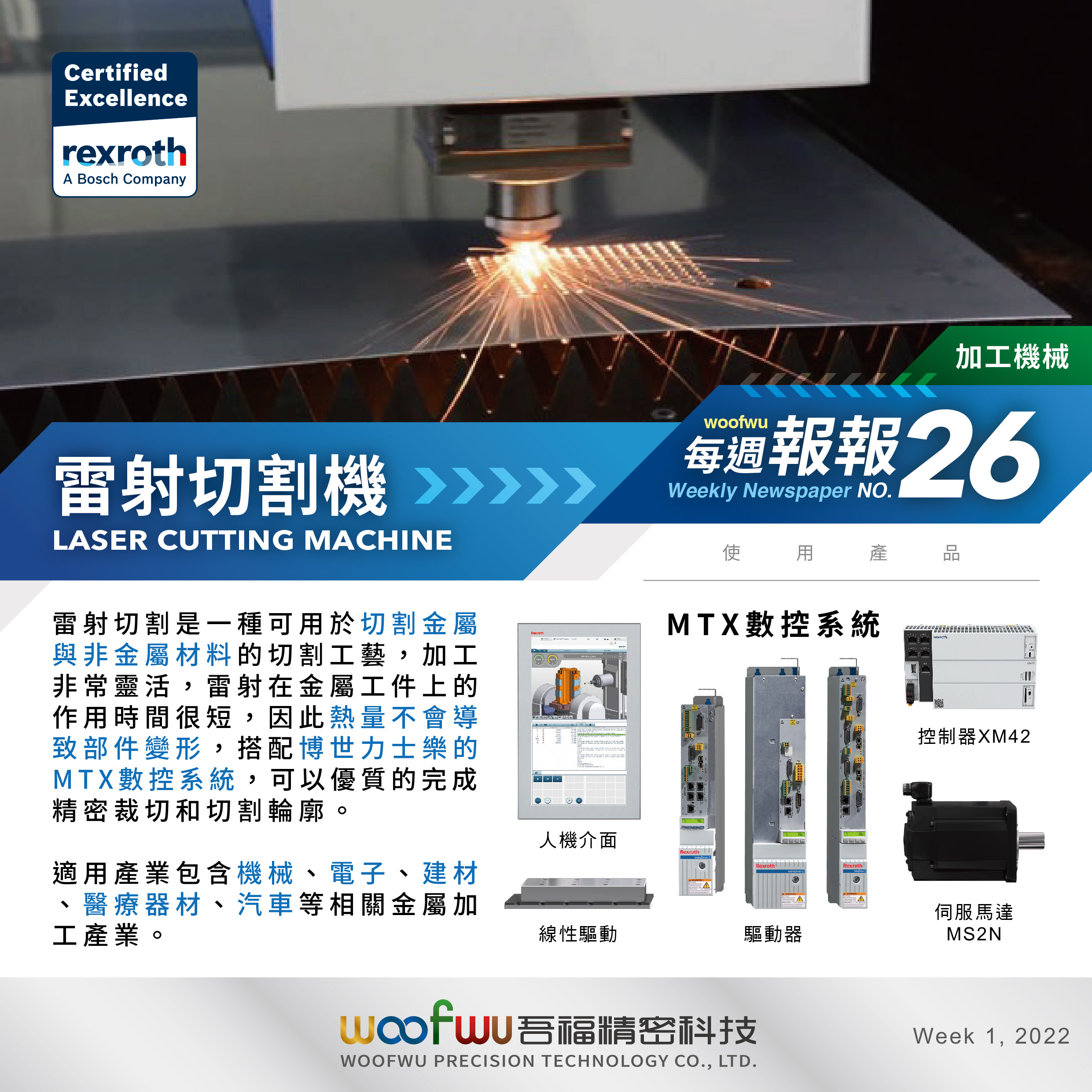 雷射切割是一種可用於切割金屬與非金屬材料的切割工藝,加工非常靈活,雷射在金屬工件上的作用時間很短,因此熱量不會導致部件變形,搭配博世力士樂的MTX數控系統,可以優質的完成精密裁切和切割輪廓。